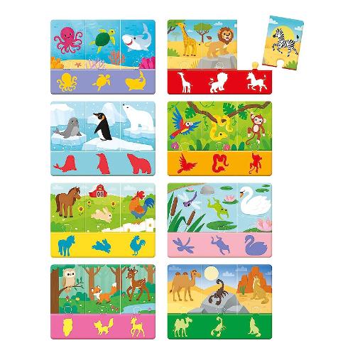 Un ricco e colorato gioco tattile ispirato alla pedagogia montessori. Il gioco contiene 8 puzzle da 4 pezzi con colorate illustrazioni di animali e le relative sagome. Il bambino dovrà quindi associare le immagini degli animali alle sagome tattili, creando così delle colorate ambientazioni. La superficie ruvida delle sagome aiuta a sviluppare il tatto dei più piccoli. Un gioco che sviluppa la manualità, la logica e la capacità associativa.