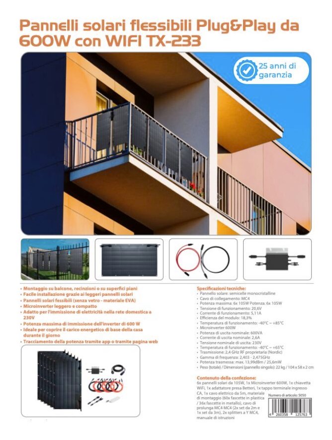 6 pannelli solari flessibili da 105W (16,8A/36V). Invertitore da 600W incluso. Con telaio perforato per un fissaggio facile e flessibile su diverse superfici (balcone, cancelli).