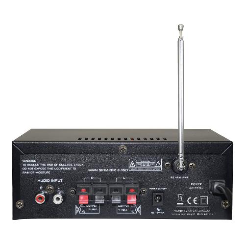 Amplificatore stereofonico dalle ridotte dimensioni ideale per l'utilizzo in negozi, reception o abitazioni.. Le prese posteriori consentono il collegamento di 2 diffusori da 30W. I segnali in ingresso potranno essere miscelati grazie ai comandi di volume frontali e la tonalità dell’intera miscelazione potrà essere regolata a piacimento. Il modulo multimediale permette di riprodurre brani da SD, USB o tramite bluetooth.