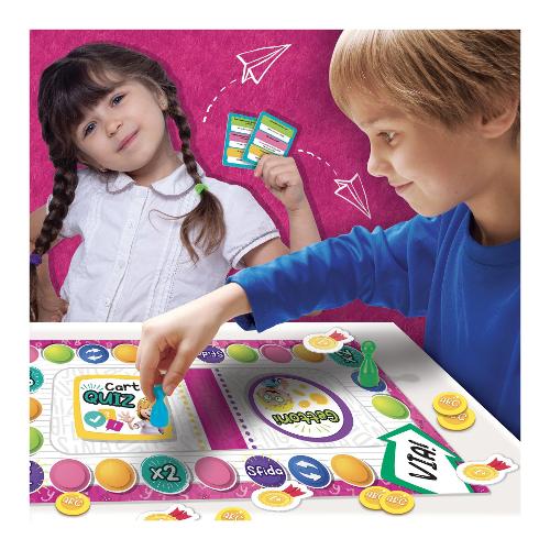 Un gioco di percorso a quiz, basato sui programmi della scuola primaria, per sviluppare il lessico e la conoscenza della lingua italiana. Grazie ai tre livelli di difficoltà, possono giocare insieme bambini di età diversa. Rispondi alle divertenti domande. Include 1 plancia di gioco - 4 birilotti - 1 spinner - 48 carte quiz - gettoni e coccarde - carte speciali