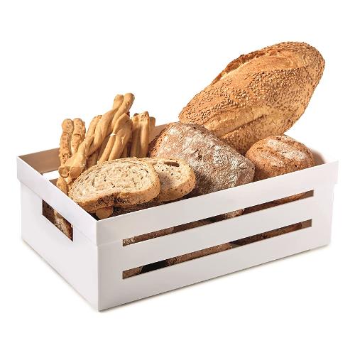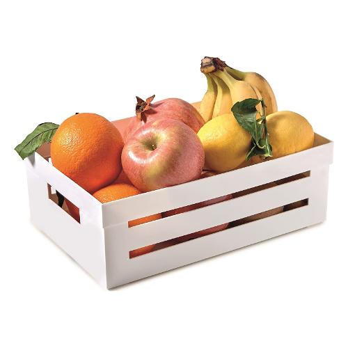 Cassetta bianca in plastica, realizzata sul design di una cassetta in legno. Il design la rende un accessorio da cucina bello da tenere a vista sul top o sulle mensole. Il contenitore per cucina ti aiuta nell'organizzazione degli spazi: porta frutta e verdura, pane, barattoli. La usi quando cucini, per avere sempre a portata di mano le cose che servono più spesso. La porti in tavola come contenitore per servire: come porta pane, grissini o come porta frutta.
