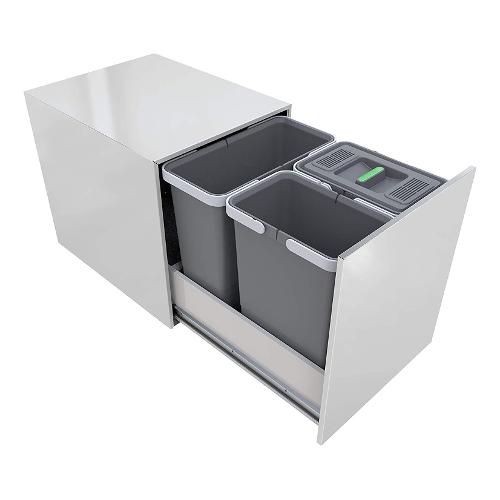 Sistema ad estrazione frontale in acciaio inox lucido AISI 430 per la raccolta differenziata. Design lineare e minimale, massima cura nei dettagli sia tecnici che estetici per il prodotto ELLETIPI top di gamma. Prodotto in acciaio inox completamente riciclabile. Guide in metallo ad estrazione totale con soft-closing. Tutte le pattumiere sono dotate di un secchio con coperchio con filtro divora-odore (rigenerabile con lavaggio fino a 50 volte). Facile da pulire