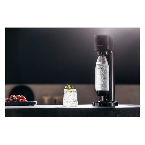 La macchina GAIA viene fornita con una bombola dotata della tecnologia brevettata Quick Connect Cylinder clip-on per produrre fino a circa 60L di acqua frizzante e una bottiglia da 1 litro, lavabile in lavastoviglie.