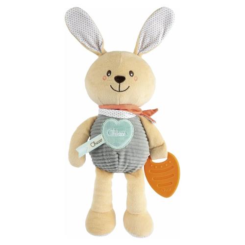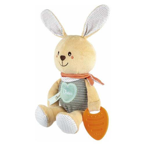 Coniglietto coccolone realizzato in diversi tessuti di alta qualità: sarà il loro primo compagno fin dalla nascita. Perfetto per accompagnare e rassicurare i piccoli durante tutta la giornata. Facile da afferrare, anche grazie alle lunghe orecchie che se toccate, scricchiolano. Ciondolo a forma di carota in morbida plastica perfetto per lenire le gengive durante il periodo della dentizione.