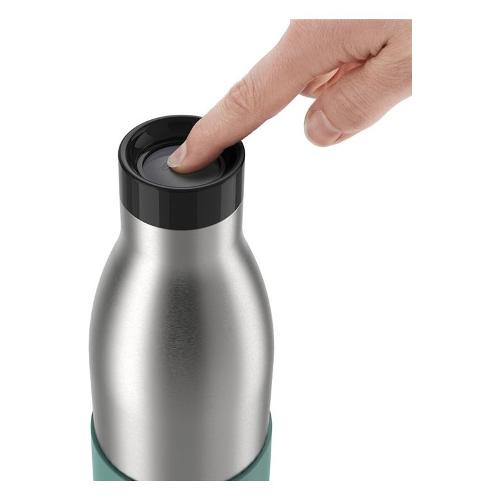 Borraccia termica con doppia parete in acciaio inossidabile e rivestimento soft-touch. 100% ermetica, apertura con la pressione di un bottone a 360°: è possible bere da tutti i lati. Tappo smontabile per una facile pulizia