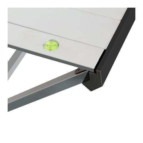 Tavolo in alluminio brevettato con ripiano arrotolabile e speciale telaio pieghevole di facile montaggio, livella a bolla integrata, piedino regolabile