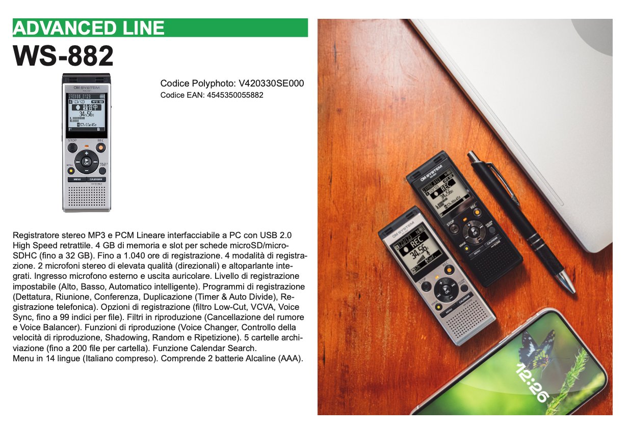L'OM SYSTEM WS-882 è un registratore vocale stereo compatto e versatile, perfetto per catturare appunti personali e conversazioni in movimento. Il suo design innovativo e la sua tecnologia evoluta lo rendono ideale sia per gli studenti che per i professionali, garantendo ogni volta registrazioni di alta qualità.