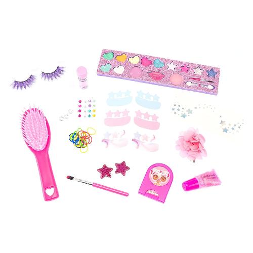 La confezione include: testa di bambola con capelli lunghi e meccanismo per cambiare colore degli occhi, spazzola, molletta con fiori, vassoio con trucchi e applicatori, ciglia finte, magazine con consigli di stile, adesivi scintillanti e gemme per viso/corpo, elastici, mollette con paillettes, gessetto per colorare i capelli, pennello, gel glitterato per capelli.