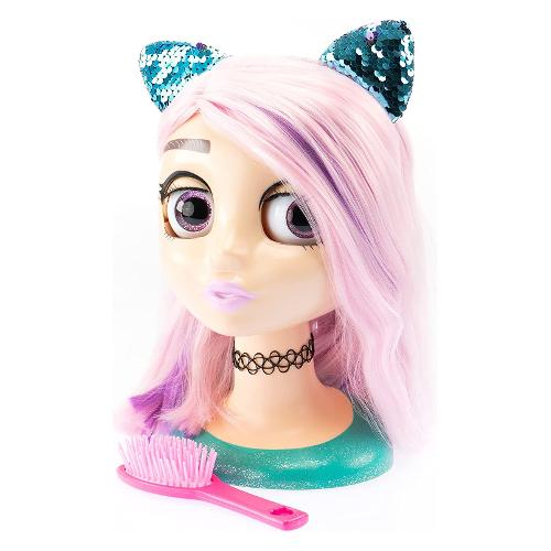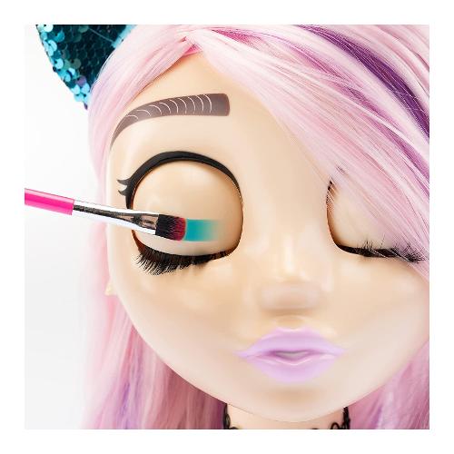 Testa di bambola da truccare e pettinare con occhi che cambiano colore grazie alla leva applicata nella parte posteriore; le bambine si divertiranno a truccare il volto della influencer e creare nuovi look con il set di trucchi in dotazione, imparando a fissare le mollette e gli elastici ai capelli per nuove acconciature e ad abbinare i colori degli ombretti e dei lucidalabbra.