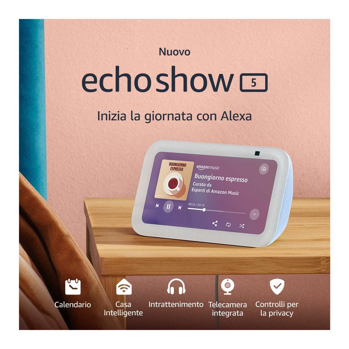 Il nuovo Echo Show 5 è dotato di uno schermo da 5,5”’, per controllare a colpo d’occhio il meteo e le ultime notizie, riprodurre in streaming musica, programmi e molto altro. Imposta sveglie e timer con la tua voce e personalizza la tua routine mattutina per svegliarti con l’accensione delle luci e la tua canzone preferita.