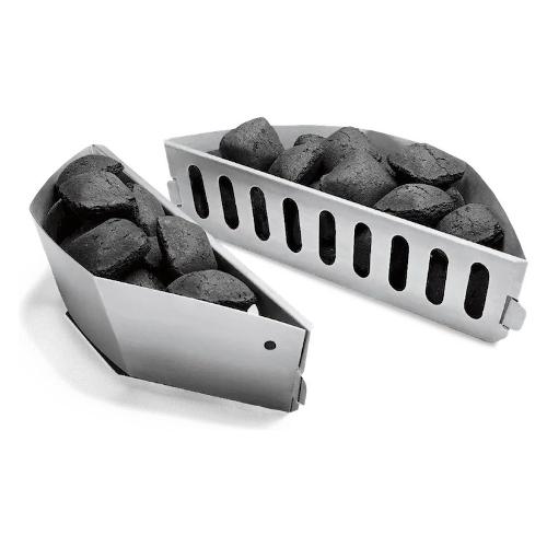 Concentrati sul cibo, le spezie e la compagnia: il resto è facile. I cesti separa carbone, ti consentono di disporre in modo uniforme e senza alcun sforzo il carbone acceso sulla griglia del combustibile per creare il calore indiretto necessario per grigliare un pollo intero o costolette, alla perfezione. Versa la carbonella accesa dalla tua ciminiera nei cesti e comincia a grigliare.