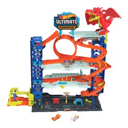 Sfreccia, esibisciti in acrobazie pazzesche e affronta un drago nel Mega Garage Hot Wheels™ City multilivello. Il primo livello presenta fantastici dettagli, come pompe di benzina mobili, un autolavaggio con un rullo in schiuma, deviatori e connettori per collegare il playset ad altri set e creare una Hot Wheels™ City ancora più grande. (Set aggiuntivi in vendita separatamente). Porta l'ascensore a due posti al secondo livello e lancia le 2 macchinine Hot Wheels® 1:64 incluse in una sfida testa a testa. Al terzo livello, lanciati in un testa a testa nel giro della morte, regolando i deviatori per cambiare le destinazioni delle macchinine.Al quarto livello un drago divora auto attende i bambini che lanciano le Hot Wheels® per sconfiggerlo o essere divorati. Le auto divorate vengono espulse, mentre il drago sconfitto precipita in fondo al garage.