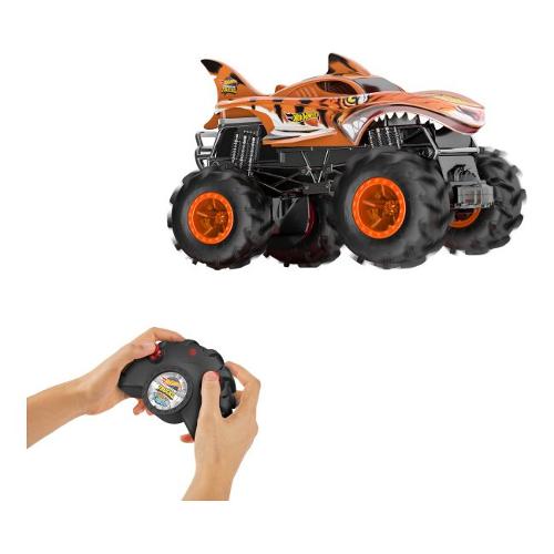 Sfreccia verso avventure piene d'azione con il Monster Truck radiocomandato HW Tiger Shark RC™ Hot Wheels® Monster Trucks, che porterà battaglie e scontri epici direttamente a casa tua. Questo veicolo con radiocomando multifunzione è dotato di pneumatici Terrain Action™ per migliorare le prestazioni su diversi terreni e ha una portata di 30 metri. È dotato di un sistema di sterzo a trazione integrale e può raggiungere una velocità di 8 km/h a terra. Fallo impennare per invertire la direzione di acrobazie e scontri! Rivivi le tue battaglie testa a testa preferite di Monster Trucks Live, lanciati in acrobazie e scatena la forza.Ciascun veicolo radiocomandato opera su una frequenza di 2,4 GHz, per consentire il controllo di più veicoli contemporaneamente senza interferenze.