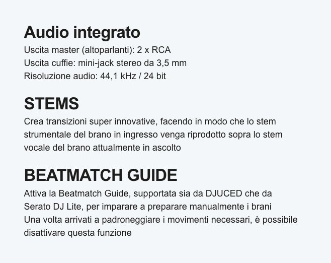 Impara facilmente i fondamentali dell’arte del DJ e divertiti a mixare i tuoi brani preferiti con Hercules DJControl Inpulse 200 MK2. Disponibile oggi assieme a Serato DJ Lite e DJUCED, questo controller DJ offre nuove ed esclusive funzioni, tra cui gli STEMS, che ti permettono di mixare la parte strumentale di un brano con la parte vocale di un altro brano. Goditi illimitate possibilità di mixaggio, dando libero sfogo alla tua creatività! Utilizzando la funzione Beatmatch Guide, potrai sincronizzare tra loro i tuoi brani con l’aiuto delle guide luminose integrate, presenti sotto ciascuna manopola jog e alla destra di ciascun fader del tempo. Grazie a 8 pad e 4 modalità (Hot Cue, Stems, FX, Sampler), potrai divertiti e essere creativo realizzando transizioni tra i brani degne dei DJ più in voga!