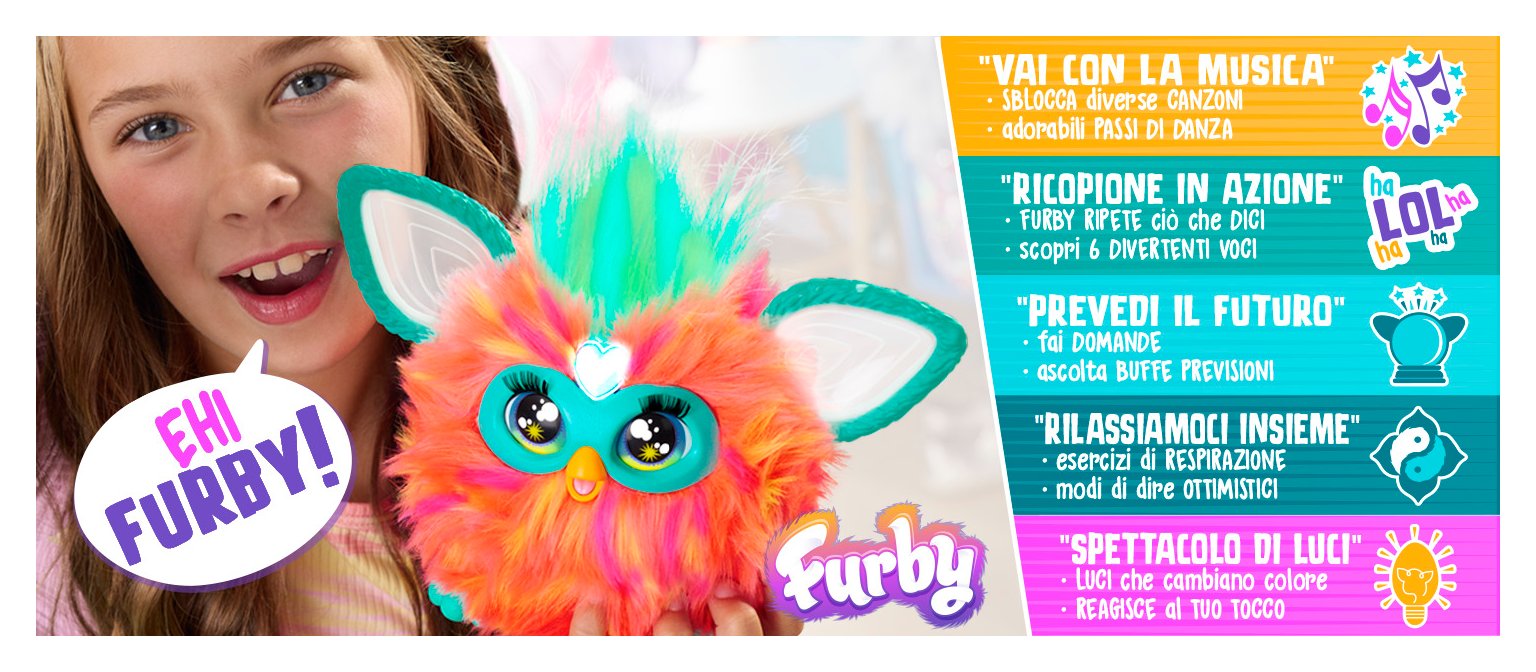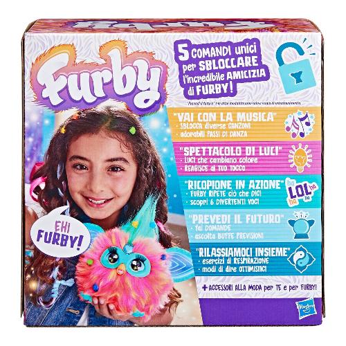 Regala a bambini e bambine un peluche con cui stringere un'amicizia speciale grazie a questo incredibile giocattolo interattivo per bambini e bambine che si muove, parla, canta, si illumina e risponde alle tue frasi; premi la gemma a forma di cuore di furby e di' "ehi furby!" In modo che furby possa sentire, poi pronuncia un comando per scoprire ciascuna modalità (non si connette a internet); parla, canta e ridi insieme a questo giocattolo parlante che offre tantissime reazioni adorabili, spassose e a volte anche un po' impertinenti. Furby è anche un giocattolo ballerino con occhi che si aprono e chiudono e orecchie che si illuminano con effetti luminosi di diverso colore; se metti insieme 2 amici furby, possono interagire tra di loro! Ciascun furby venduto separatamente ; bambini e bambine possono personalizzare il proprio stile e quello di furby. Con le perline a clip e il pettine, possono acconciare il suo ciuffo di capelli o creare un braccialetto o una collana dell'amicizia . Furby è un regalo fantastico per bambini e bambine da portare con sé quando si viaggia o per giocarci nella propria camera. Trova il tuo furby e dona un regalo indimenticabile