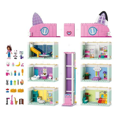 La casa delle bambole di gabby contiene 8 camere colorate collegate da un ascensore mobile. Ogni stanza è piena di attività. Ad esempio, i bambini possono preparare pasti in cucina, usare lo scivolo nella stanza dei giochi, scatenare la loro creatività nella stanza d’arte, suonare il piano nella stanza della musica, rilassarsi in bagno, fare un pisolino in camera da letto o salire sul tetto per un festa sulla pista da ballo girevole. I bambini condividono le loro avventure con 4 personaggi famosi dello spettacolo: gabby, pandy panda, dolcetto e siregatta. C’è una guida alla costruzione con la storia illustrata e l’app lego builder ha strumenti intuitivi di zoom e rotazione. Un grande starter brick assicura che il divertimento inizi subito.