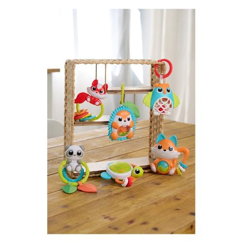 Trillino elettronico a forma di tartaruga con suoni e luci. Premendo il guscio della tartaruga si attivano luci e melodie. Scuotendo le foglie all’interno del guscio trasparente si può sentire un suono tintinnante. Le zampe della tartaruga in plastica morbida sono ideali per la dentizione. Morbidi anelli scorrevoli con motivi in rilievo.