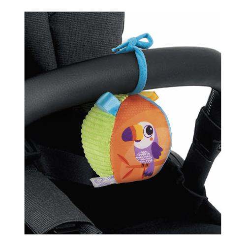 Una palla morbida da portare sempre con sé: i lacci in tessuto facilitano il fissaggio a carrozzine, passeggini e seggiolini.