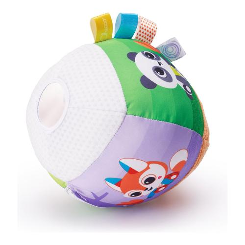 Morbida palla musicale elettronica realizzata in vari tessuti, con etichette e simpatiche illustrazioni di animali.