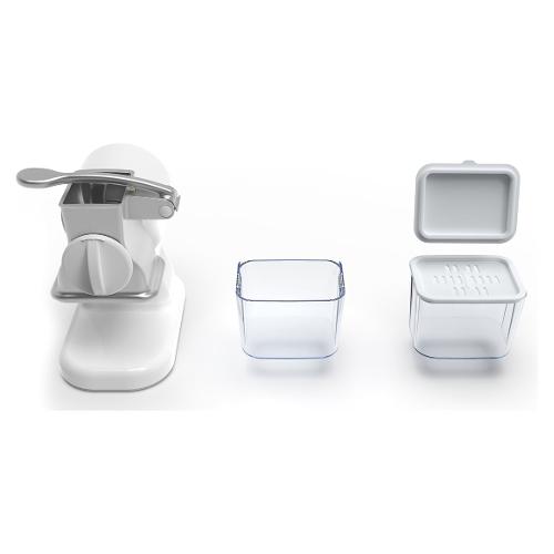 Grattugia elettrica con rullo in acciaio inox estraibile lavabile in lavastoviglie. Tramoggia in alluminio smontabile e lavabile in lavastoviglie. Ideale per grattugiare formaggio duro, pane secco ed alimenti simili. Grattugia il formaggio direttamente nel pratico contenitore estraibile e servilo direttamente in tavola; grazie al coperchio salvafreschezza potrai poi conservarlo nel tuo frigorifero.