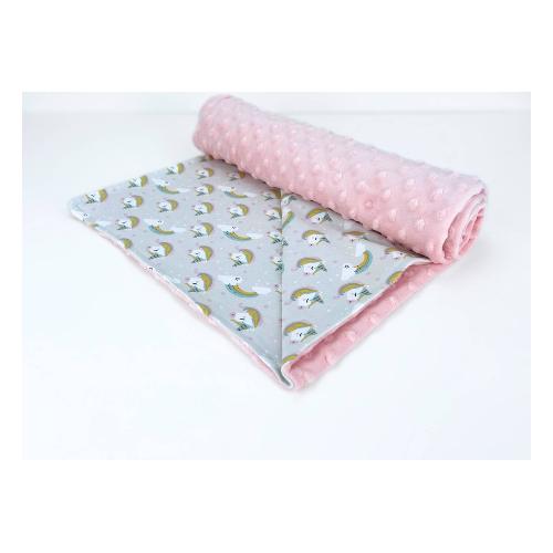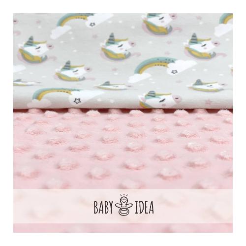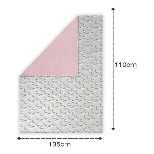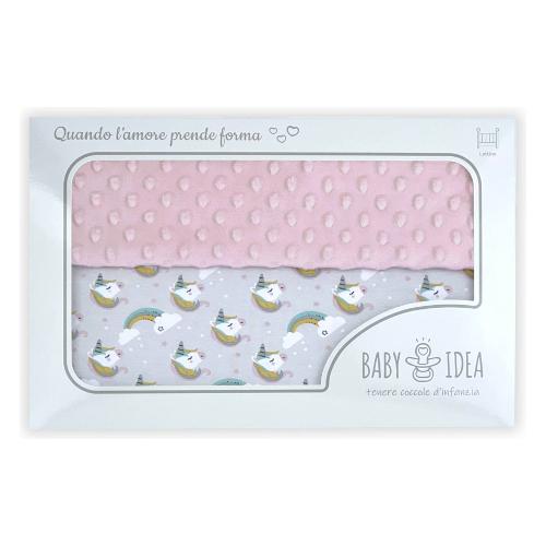 Coperta lettino jersey 100% cotone e pile minky 100% poliestere (135x110cm) Unicorno rosa PLUR