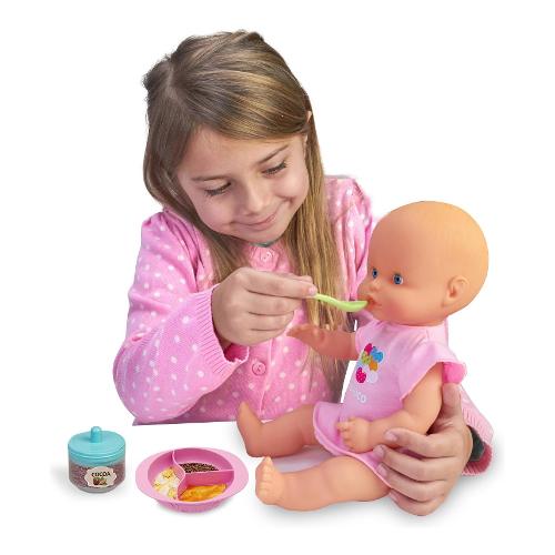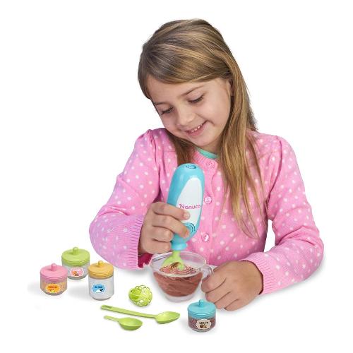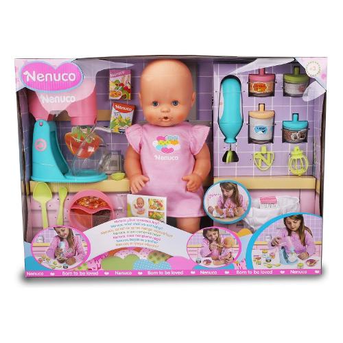 Con Nenuco sarà possibile preparare delle ottime e gustose merende. Include due accessori elettronici: un mixer e un impastatrice con 4 diversi accessori che possono essere condivisi per fare diverse pappe: 4 tuppers, 3 diversi cucchiai, due scatole di cartone, un piatto, un misurino e un pannolino di stoffa riutilizzabile. Nenuco può mangiare e bere!