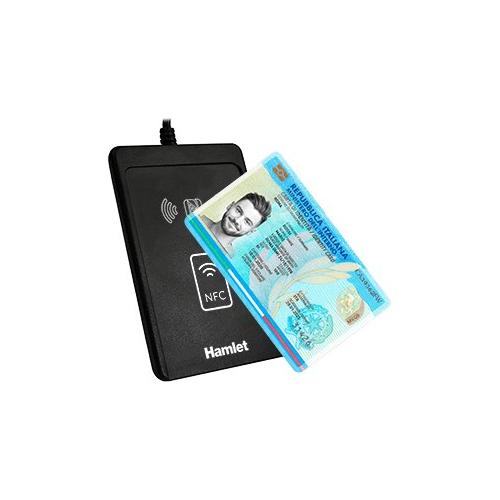 Lettore di Smart Card contactless NFC che si collega al PC e permette di utilizzare la Carta di Identità Elettronica (CIE) e la Tessera Sanitaria contactless per accedere ai servizi on-line della pubblica amministrazione, di firmare documenti digitali e di accedere in modo sicuro a siti web per l'Home Banking, il commercio elettronico e altre applicazioni che richiedono dati sicuri. Il lettore NFC è inoltre compatibile con il software delle camere di commercio italiane per la firma digitale