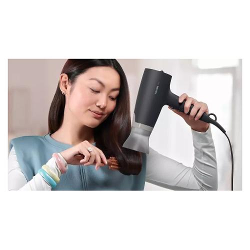 Trattamento Ionic Care avanzato per capelli luminosi, senza effetto crespo. L'esclusivo accessorio ThermoProtect crea un potente mix di aria calda e fredda per un uso quotidiano.