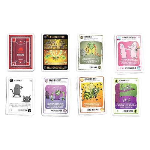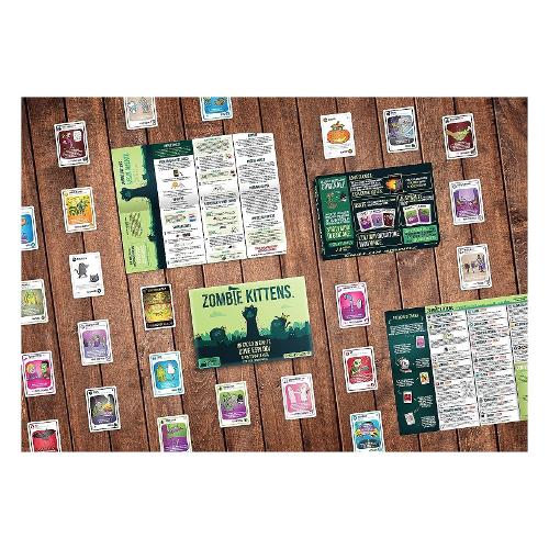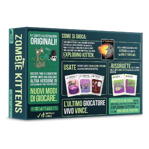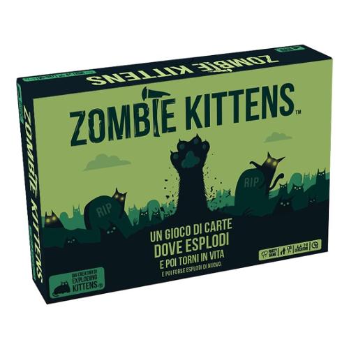 Exploding kittens è un card game veloce e immediato che saprà appassionare tutti: perché tutti amano i gattini...e le esplosioni. I giocatori pescano carte fino a quando qualcuno non incappa nella temuta carta exploding kitten: a quel punto quel qualcuno esplode ed è eliminato dal gioco, a meno che non abbia una carta disinnesgatto per evitare l'esplosione. In zombie kittens è possibile usare potenti carte azione per muovere o evitare la carta exploding kitten, e risorgere dalla tomba con la carta zombie kitten per avere la vostra vendetta!
