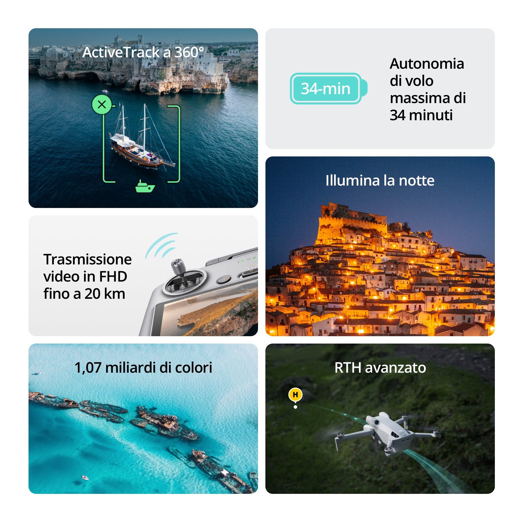 DJI Mini 4 Pro è il nostro mini drone con fotocamera più avanzato mai realizzato. Integra immagini superbe, rilevamento degli ostacoli omnidirezionale, ActiveTrack a 360° insieme alla nuova modalità Traccia e trasmissione video FHD fino a 20 km