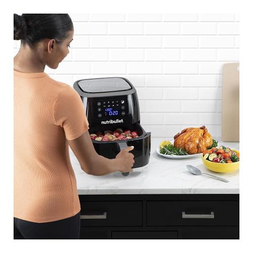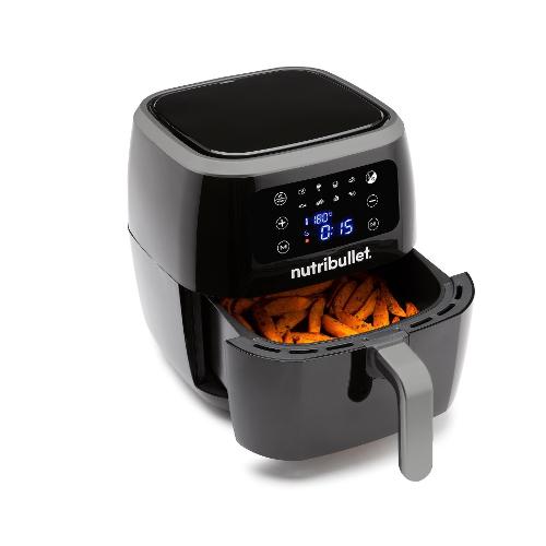 Nuova friggitrice ad aria nutribullet XXL; la potente friggitrice ad aria da 1800W, un design moderno e un'ampia capienza del cestello da 7 litri che permette di cuocere 1,4kg di patatine fritte. Convezione a 360 gradi per una cottura croccante utilizzando pochissimo olio; schermo touch con 8 programmi di cottura. Facile da pulire con cestello e piatto per cotture croccanti entrambi lavabili in lavastoviglie.
