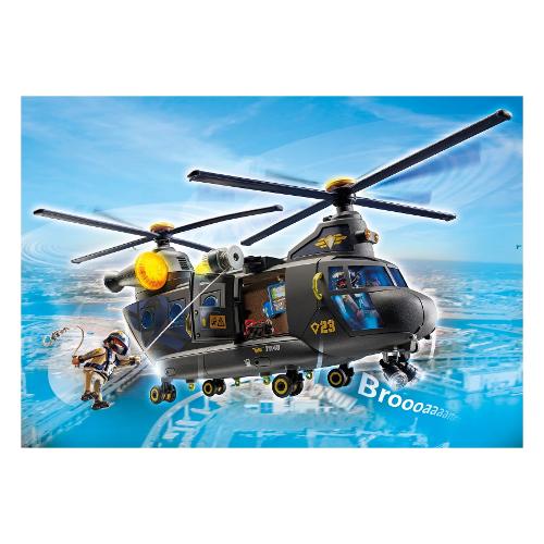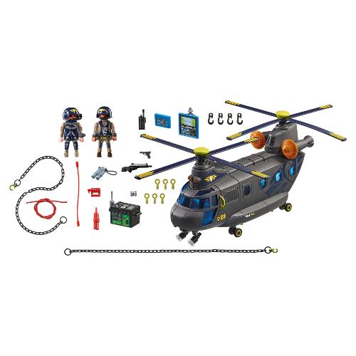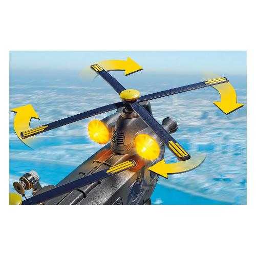 Elicottero con modulo luminoso e sonoro, due personaggi playmobil e un fantastico equipaggiamento da polizia per un gioco di ruolo ricco di azione.