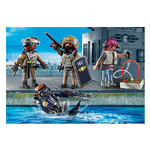La squadra dell' unità speciale è pronta ogni volta che la polizia playmobil ha bisogno di un supporto extra. Il playset contiene tutto ciò che serve ai giovani poliziotti per mettere insieme una squadra di pronto intervento, come un sommozzatore dell' unità speciale, un coordinatore delle operazioni e un ufficiale. Con le sue attrezzature speciali, la squadra è alle calcagna del fuggitivo. Il crimine non ha scampo contro questa task force! Con edifici ricchi di funzioni, fantastici veicoli e diversi personaggi, la linea PLAYMOBIL City Action stimola un gioco di ruolo divertente e fantasioso. con quattro personaggi PLAYMOBIL, tre dell' Unità Speciale e una criminale donna, bombola, casco, GPS, piede di porco e numerosi equipaggiamenti per inseguimenti ricchi di azione nella cameretta dei bambini.