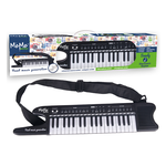 Keytar elettronica a 37 tasti , 8 suoni , 6 ritmi , 10 brani , registrazione e riascolto , OKON (Funzione di apprendimento) , Regolazione del volume , Presa per cavetto USB-DC (fornito) o per adattatore da rete (non fornito) , Presa per microfono (non fornito) , Presa cuffia (non fornita) , Presa per sorgente musicale esterna (lettore MP3, smartphone, ecc.) , Alimentazione: con adattatore da rete (non fornito) o con cavetto USB-DC (fornito) da collegare ad una power bank, PC, cecc. (non forniti) o con 4 batterie da 1,5V tipo R6/AA (non fornite) , Tracolla