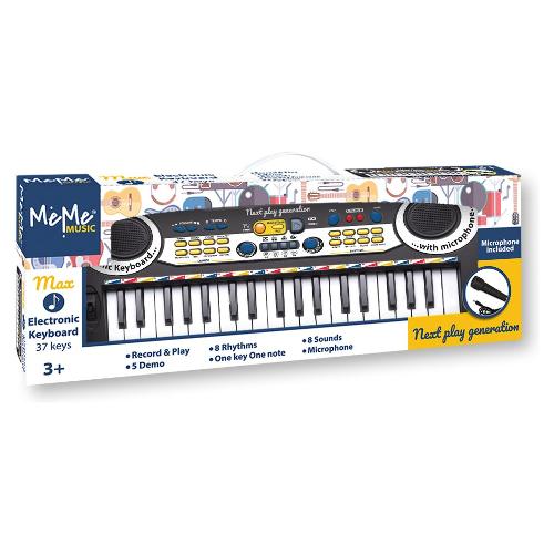 Tastiera elettronica 37 tasti midi , 8: Suoni , Ritmi ; 5 canzoni , Any key play , 4: suoni di batteria, variazioni ritmiche , effetti ; Registrazione e riascolto,, Ritmo programmabile, Controlli: Volume generale, Stop, Tempo +/– , Sustain, Vibrato, Eco , Presa per adattatore da rete (non incluso) , Presa per microfono a condensatore (incluso) , Alim: 4 batterie da 1,5 V R6/AA (non fornite)