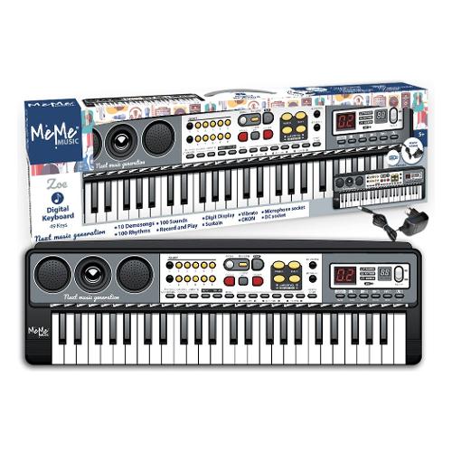 Tastiera digitale a 49 tasti, connessione wireless. 100 suoni, 100 ritmi con facile programma di accordi, 10 canzoni, sequencer per la registrazione e la riproduzione. Effetti: vibrato, sustain. Volume generale, Start/Stop/Tempo, Fill in, Sync. 5 pad per suonare la batteria. Controllo del volume e dell'avanzamento delle tracce. Presa per adattatore di rete. Presa microfono a condensatore (non fornito), leggio. 2 Digit display. Cavo USB per power bank (incluso). Batterie, 4 R6 AA, non incluse.