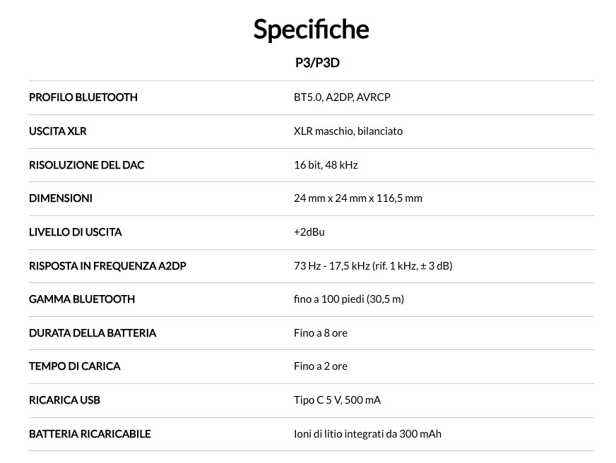 L'ultracompatto P3 consente al tuo mixer o cabinet per altoparlanti PA attivo di ricevere audio Bluetooth wireless da uno smartphone, tablet o laptop. Basta collegare il P3 a un ingresso XLR del mixer o dell'altoparlante amplificato, accoppiare il dispositivo Bluetooth e dare inizio alla festa!