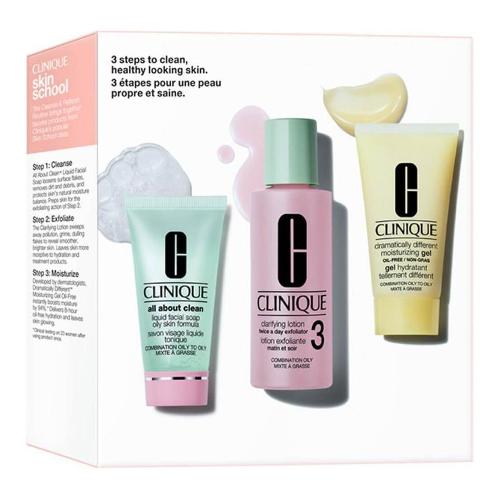 Lo Starter Kit Skincare Routine 3 Step Pulizia+Esfoliazione+Idratazione per pelle da normale a oleosa contiene: All About Clean Liquid Facial Soap Oily 30 ml: Sapone per il viso per pelle da normale a oleosa. Dona confort alla pelle, lasciandola pulita e rinfrescata. Clarifying Lotion 3 60 ml: Lozione per pelle oleosa esfolia delicatamente la superficie cutanea, eliminando ogni forma di desquamazione e rendendo la pelle più più fresca e vitale. Drammatically Different Moisturizing Gel 30 ml: Una formula idratante adatta alla pelle mista, mantiene il livello di idratazione ottimale. Priva di olii e a rapido assoribimento. Cofanetto contenente: All About Clean Liquid Facial Soap Oily 30 ml + Clarifying Lotion 3 60 ml + Drammatically Different Moisturizing Gel 30 ml.