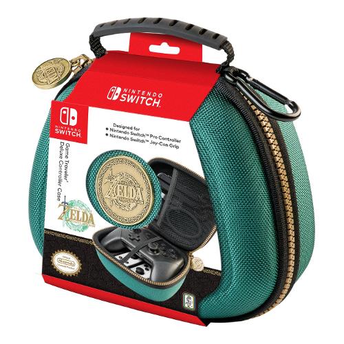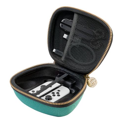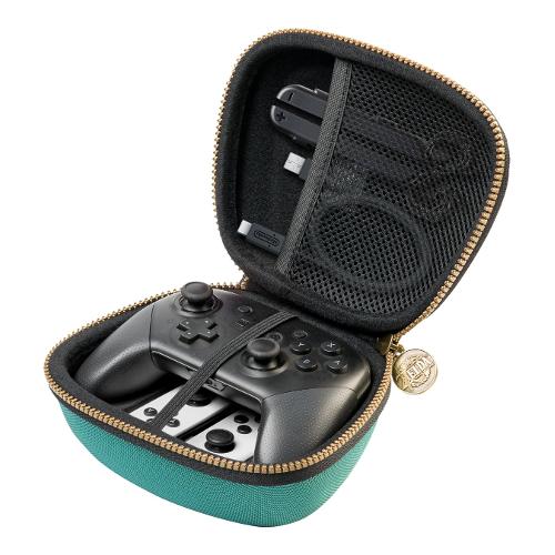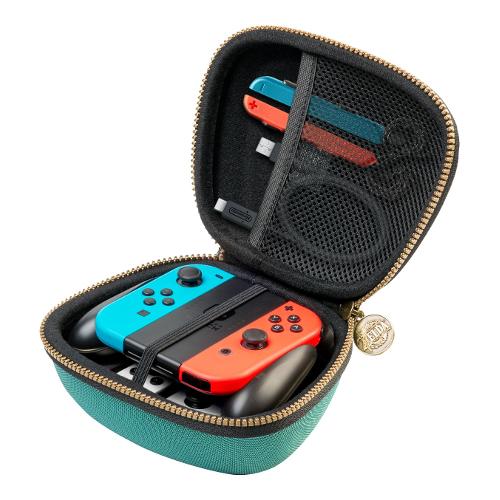 Custodia per controller deluxe Zelda Tears of the Kingdom. Inserto base incassato per ospitare Joy-Con aggiuntivi. Tasca superiore in rete per riporre in sicurezza il cavo di ricarica e i cinturini