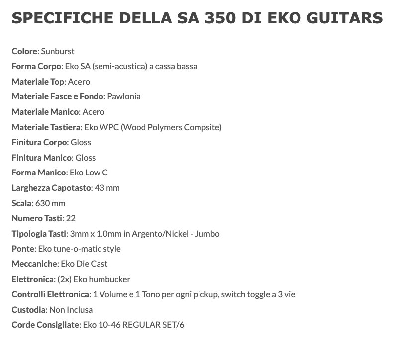 La SA 350 è la chitarra semi-acustica a cassa bassa della serie "Tribute Jazz" di casa Eko Guitars, costruita con top in Acero, fasce e fondo in Pawlonia, manico in Acero e tastiera 22 tasti in Eko WPC. Monta due pickup Eko humbucker, selettore toggle a 3 vie, controlli di Volume e Tono per ogni pickup, ponte in stile tune-O-matic. Con look e caratteristiche di stampo vintage, risulta ideale per il chitarrista amante della musica jazz e rock 'n roll anni '50/'60, ma trova il suo spazio anche nella musica hard-rock.