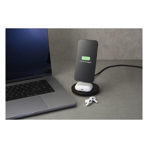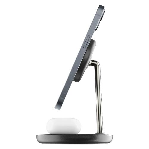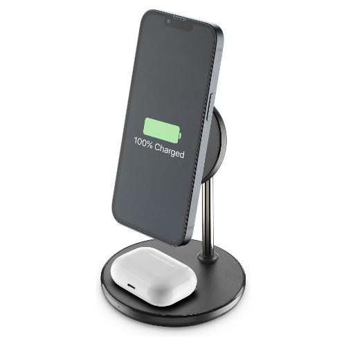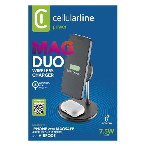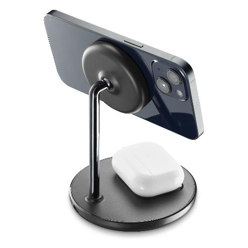 MAG DUO WIRELESS CHARGER è il supporto da tavolo con ricarica wireless magnetica, progettato appositamente per i modelli di iPhone compatibili con la tecnologia MagSafe.Sulla base del supporto è presente un pad, per caricare con tecnologia wireless Airpods e altri auricolari compatibili con questa tecnologia.Per garantire la ricarica veloce in uscita a 7.5W, è necessario utilizzare un caricabatterie USB -C adattivo da almeno 20W, non presente in confezione.