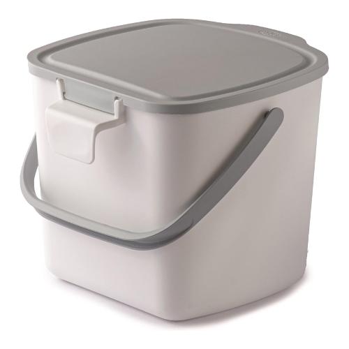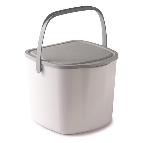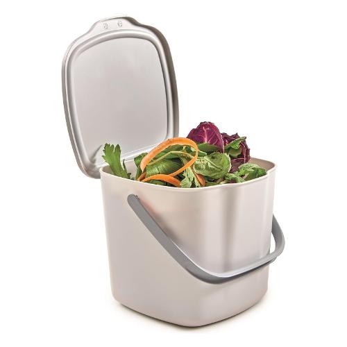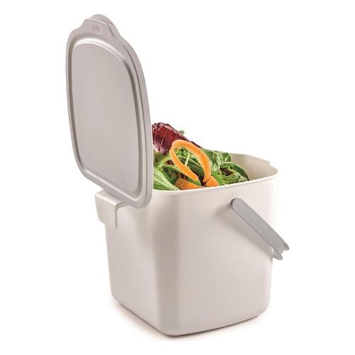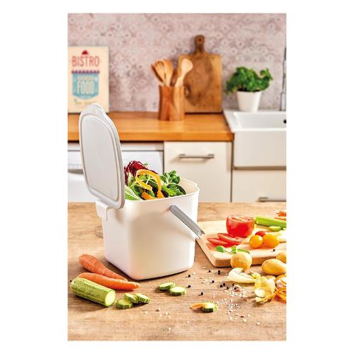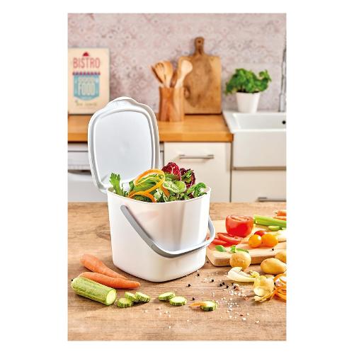 Contenitore con coperchio per gettare i rifiuti che si producono mentre si cucina. Perfetto per essere tenuto sul piano della cucina, o appeso al cassetto o al mobile della cucina, grazie al pratico gancio posteriore.