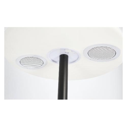 Pe, acciaio verniciato a polvere epossidica. Lampada led, 7 colori, altoparlante bluetooth. Batteria ricaricabile con cavo usb 2 m incluso. Anche a ricarica solare. Telecomando a distanza per regolazione cambio colore incluso. Per uso interno ed esterno, ip44