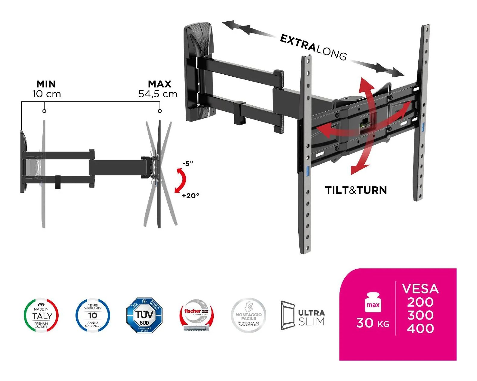 Grazie alle innovative funzioni Easy Fix Up & Down, regolare la tua TV non sarà mai stato così semplice e preciso. 400SDR è un supporto con doppio braccio per TV con foratura VESA 200-300-400 mm, adatto alle TV di medio-grande formato, dai 40" ai 82", con portata massima 30 kg.