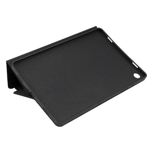 Custodia realizzata con il 35% di materiale plastico riciclato. La copertina frontale si trasforma in un comodo supporto