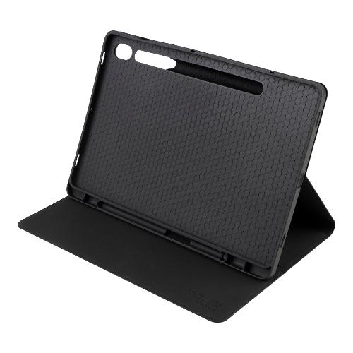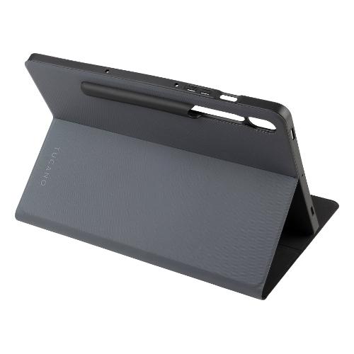 Custodia realizzata con il 35% di materiale plastico riciclato. La copertina frontale si trasforma in un comodo supporto. Vano per S Pen. Sistema On/Off integrato.