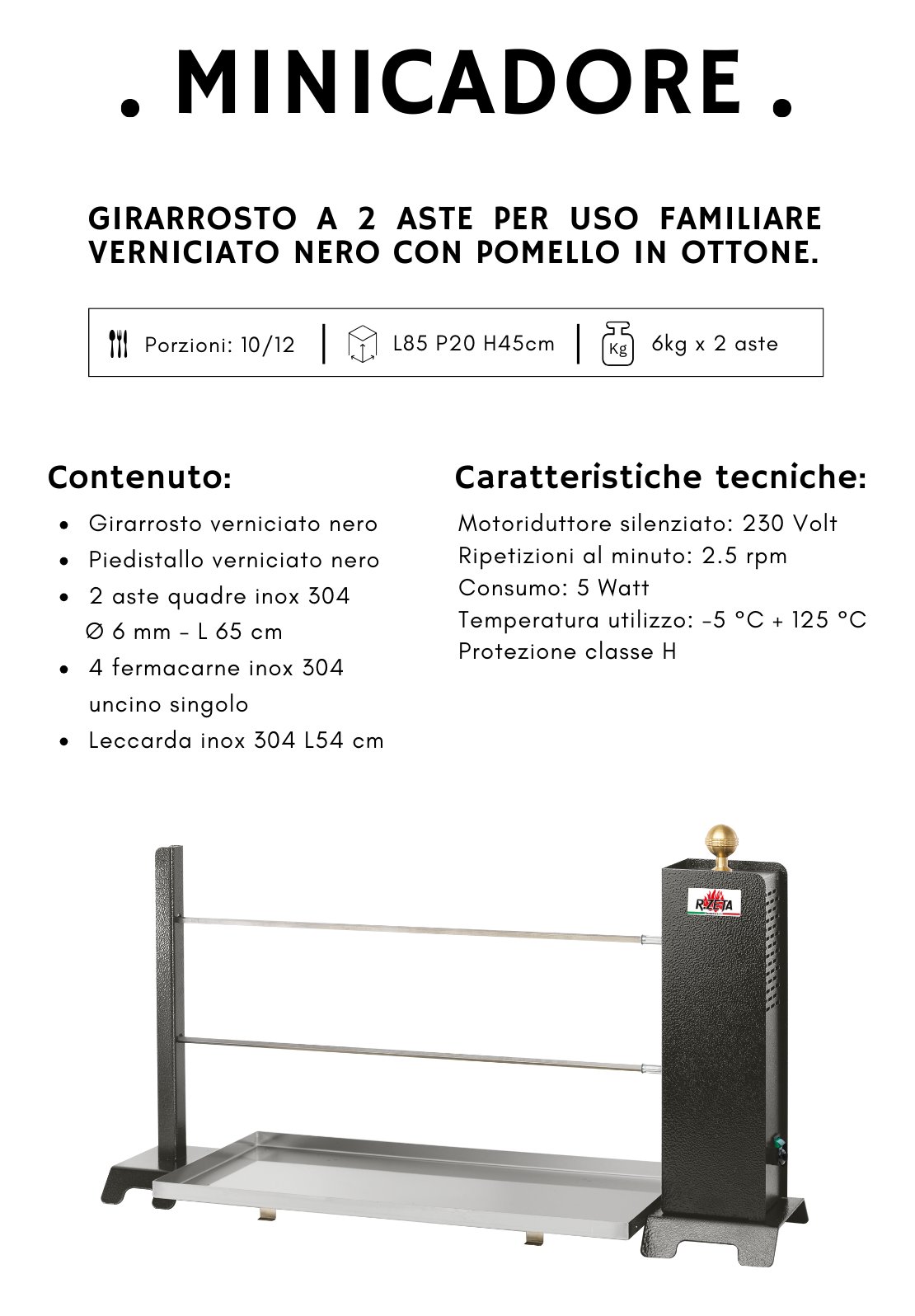 Girarrosto ad uso familiare, robusto e affidabile verniciato a polvere epossidica. Consigliato per 6 Kg di portata per ciascun motoriduttore - circa 12 porzioni. Motoriduttore silenziato: 220-240 Volt – 50-60 Hertz 2,4 ripetizioni al minuto