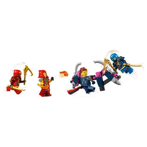 Il giocattolo ninja include 4 minifigure ninjago : climber kai e climber jay, ciascuno con una spada katana, wyldfyre con 2 pugni infiammabili e la malvagia jordana con un veicolo aliante.