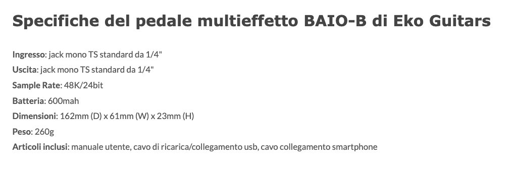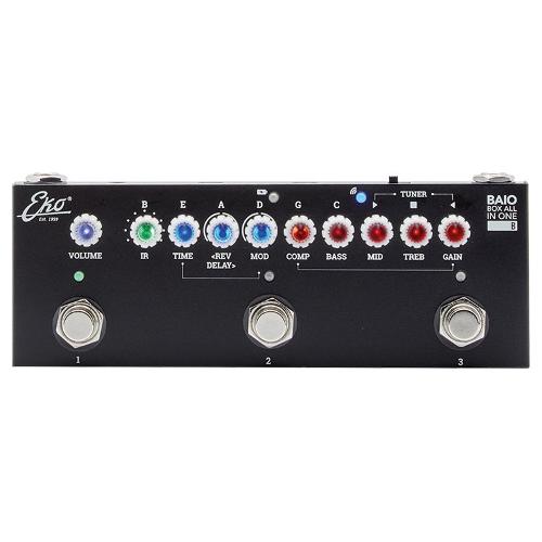 Il BAIO B è il pedale multieffetto con IR integrati per basso elettrico e acustico di Eko Guitars. Presenta 8 IR di amplificatori per basso, controlli di gain e tono completi, compressore, chorus, phaser, reverb, delay, tuner incorporato con funzione di mute, ingresso e uscita jack per strumento, uscita stereo per le cuffie, connessione bluetooth e porte usb dedicate per l'utilizzo come scheda audio in ingresso sia per PC/Mac, sia per smartphone. Il pedale ideale con cui avrai i tuoi suoni sempre con te.