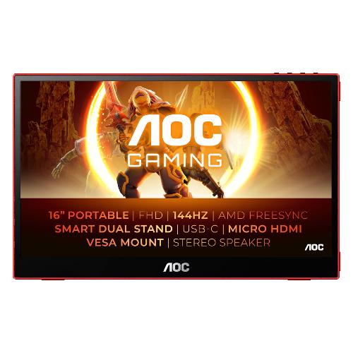 AOC GAMING 16G3 è un monitor portatile da gaming Full HD da 15,6" con pannello IPS, frequenza di aggiornamento rapida di 144 Hz, FreeSync e connettività completa per giocare ovunque